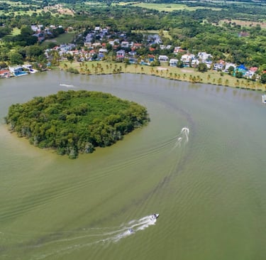 Cuenta con 43 hectáreas en agua y 2 hectáreas en isla, con una profundidad promedio de 2 metros.