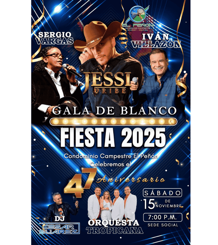 Será una noche inolvidable en la que nos reuniremos como comunidad para celebrar, compartir y vivir una experiencia llena de elegancia, alegría y buena compañía, en el entorno único y especial de nuestro Condominio Campestre El Peñón.